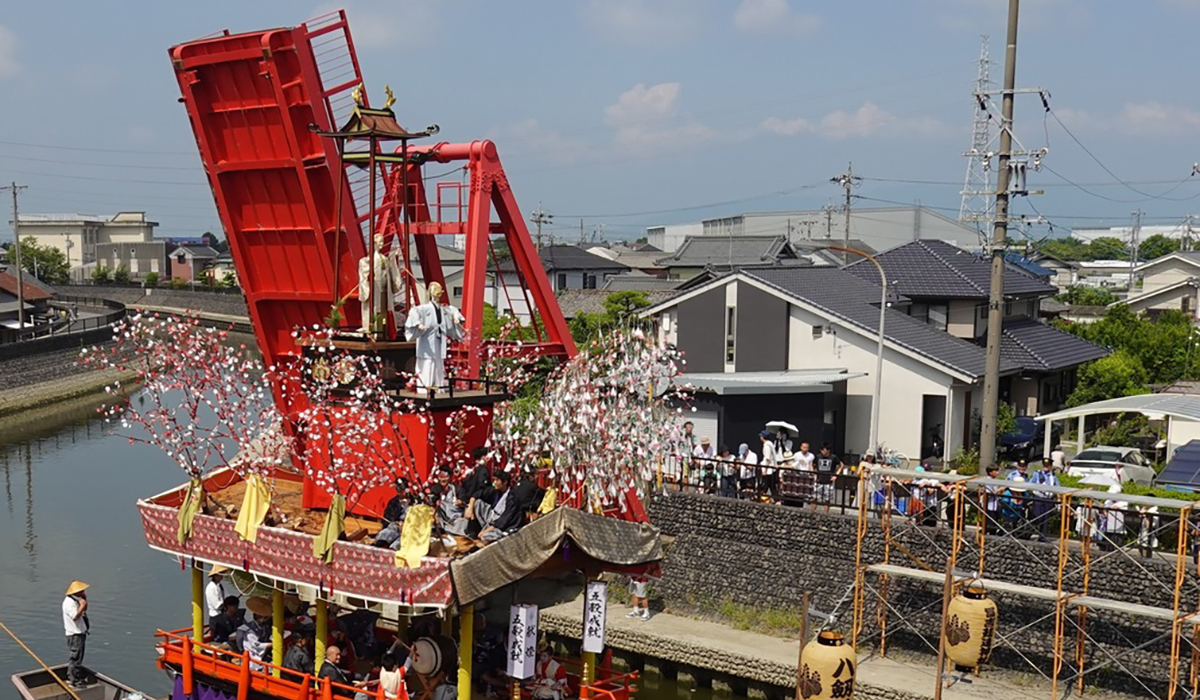 The Sunari Festival is held as a festival for the two shrines, Tomiyoshi Takehaya Shrine and Hachikensha Shrine, the guardian deities of the Sunari district, to pray for the elimination of summer epidemics and a bountiful harvest. Said to have a history of over 400 years, it was designated a National Intangible Folk Cultural Property in 2012 and registered as a UNESCO Intangible Cultural Heritage in 2016. The highlights of the festival are the "Yoi Matsuri" and "Morning Festival," which take place on the first Saturday and the following Sunday in August. During the Yoi Matsuri, straw boats adorned with lanterns float up the Kanie River, while during the Morning Festival, floats carrying dolls float up the Kanie River accompanied by musical accompaniment, creating an elegant and mystical sight. The sight of the reed bridge being raised to allow the festival boats to pass is a highlight unique to river festivals.