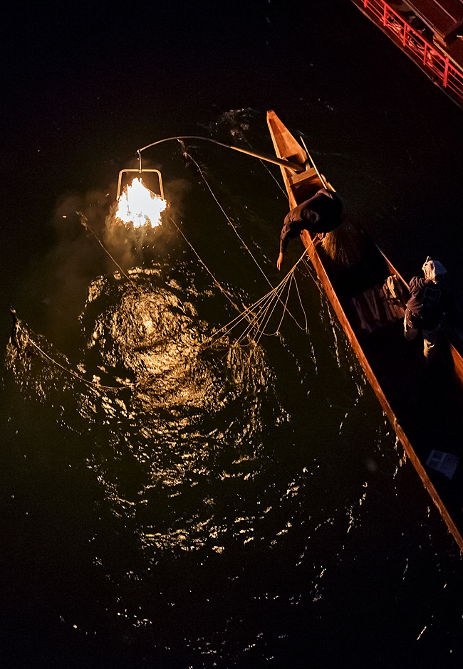 Each cormorant boat is manned by a cormorant master and a boatman, and each cormorant master controls 10 cormorants. Each boat is manned by a cormorant master and a boatman. Once the cormorants have caught the fish and come to the surface, the cormorant master pulls on the hand rope, causing the cormorants to expel the caught fish.